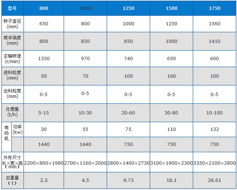 塊狀礦石由進料斗落入上破碎腔內(nèi)上甩料盤上,借助甩料盤的離心力將物料拋向筒體的內(nèi)壁,與安裝在內(nèi)壁上的反擊板猛烈碰撞,同時物料互相撞擊,使之破碎或產(chǎn)生大量發(fā)絲裂紋,接著物料進入錐形轉(zhuǎn)子腔后,在錐形空間呈螺旋狀下落,經(jīng)沖壓、擠壓,使已有裂紋的礦石進一步被破碎。由于錐形轉(zhuǎn)子與襯板間的斜度,促使較小的物料向下遷移,達到由大到小自動實現(xiàn)分級破碎。物料在錐形轉(zhuǎn)子腔內(nèi)受錘頭的打擊,高速運行塊料再次與反擊板碰撞、物料流相互碰撞使物料經(jīng)打擊、撞擊、剪切、擠壓面粉碎,從而提高破碎效率。