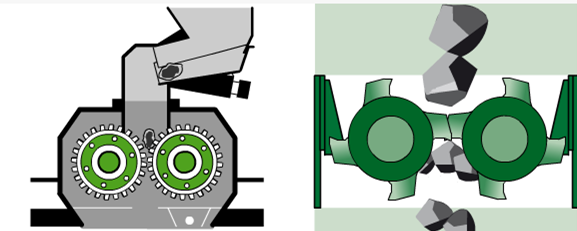 當(dāng)物料進入機器的破碎腔以后,物料受到轉(zhuǎn)動輥軸的嚙力作用,使物料被逼通過兩輥之間,同時受到輥軸的擠軋和剪磨,物料即開始碎裂,碎裂后的小顆粒沿著輥子旋轉(zhuǎn)的切線,通過兩輥軸的間隙,向機器下方拋出,超過間隙的大顆粒物料,繼續(xù)被破碎成小顆粒排出。
